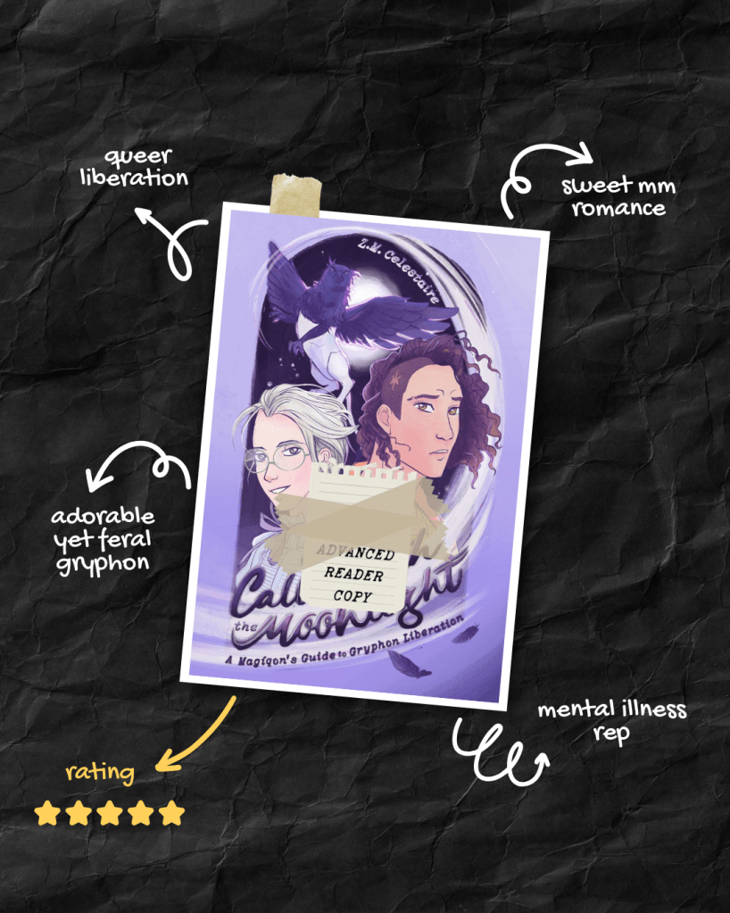 Call Forth the Moonlight by Z.M Celestaire is an amazing fantasy romance about magic, gryphons, and queer liberation. Ackerleigh and Nico are an unlikely pair but they meld together in such a beautiful way. The way Celestaire has written Nico’s mental illness really tugs at your heart. There were moments when I just wanted to cry with Nico. Leigh is a wonderful genderqueer character that is stronger than he initially appears. He fights for what he believes in and makes you root for him at every turn.